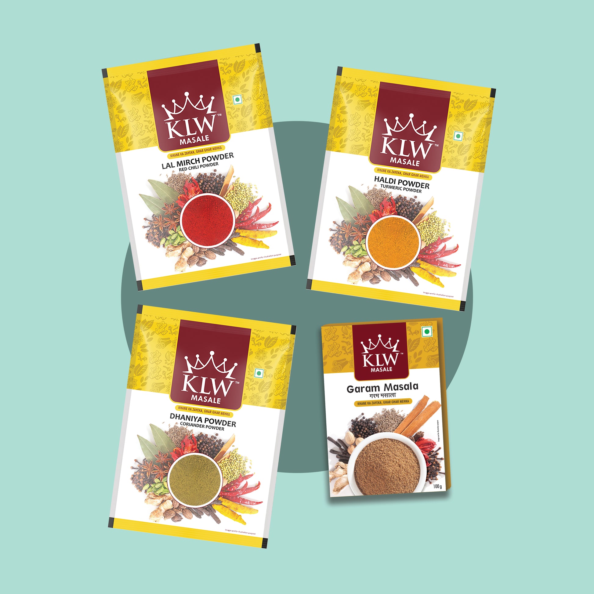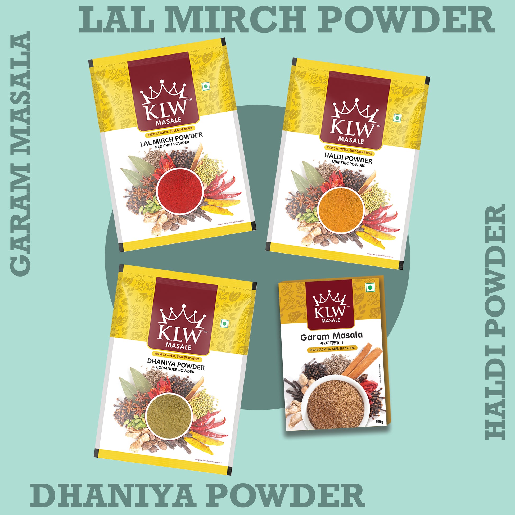 250g Lal Mirch Powder, 250g Dhaniya powder, 250g Haldi powder, 100g Gram Masala Powder