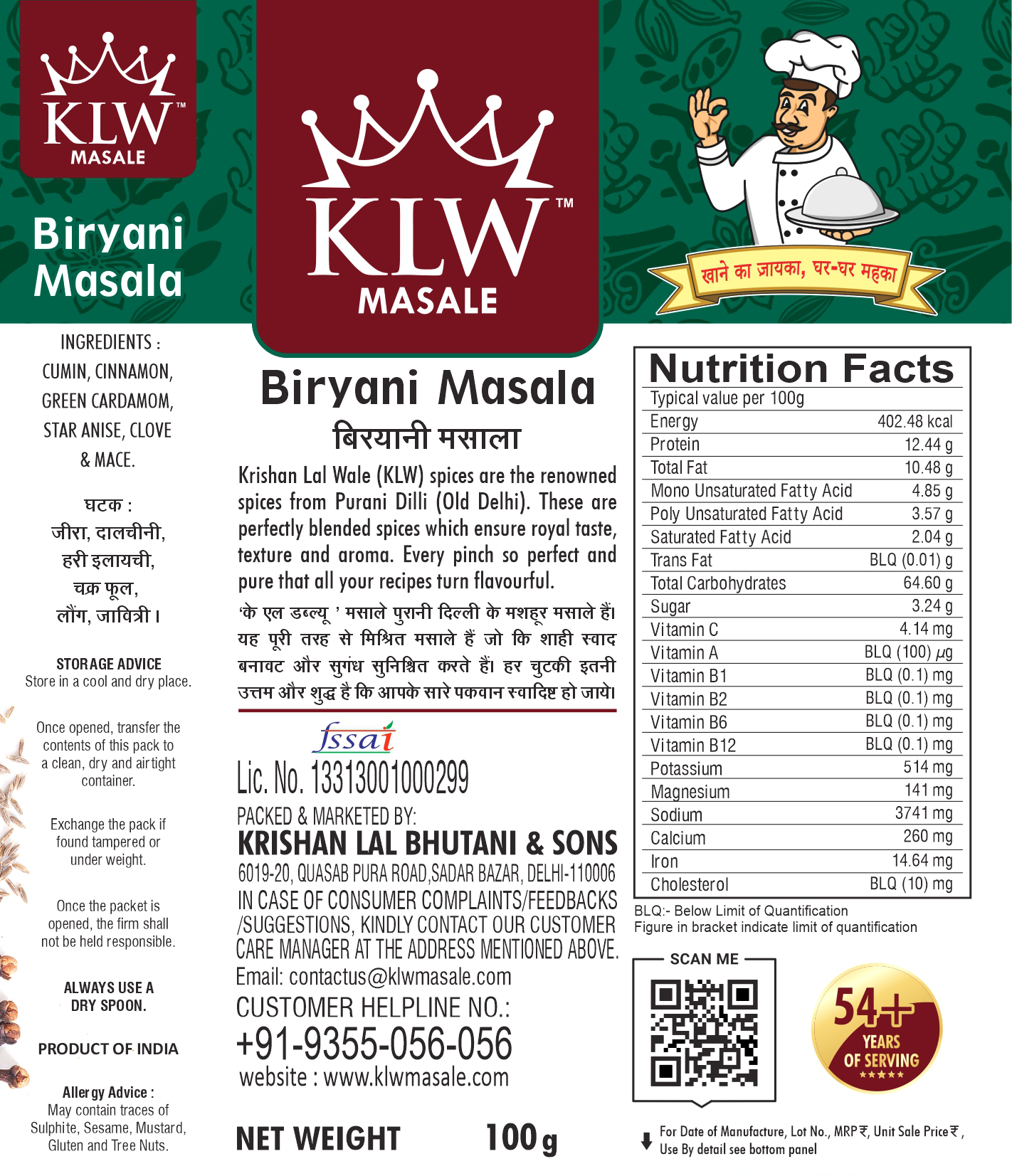 Elevate your Biryani game with KLW Biryani Masala. Our aromatic blend of just a few selected spices guarantees to add a rich and irresistible flavor to your dish. Experience the authentic taste of biryani with our special blend.