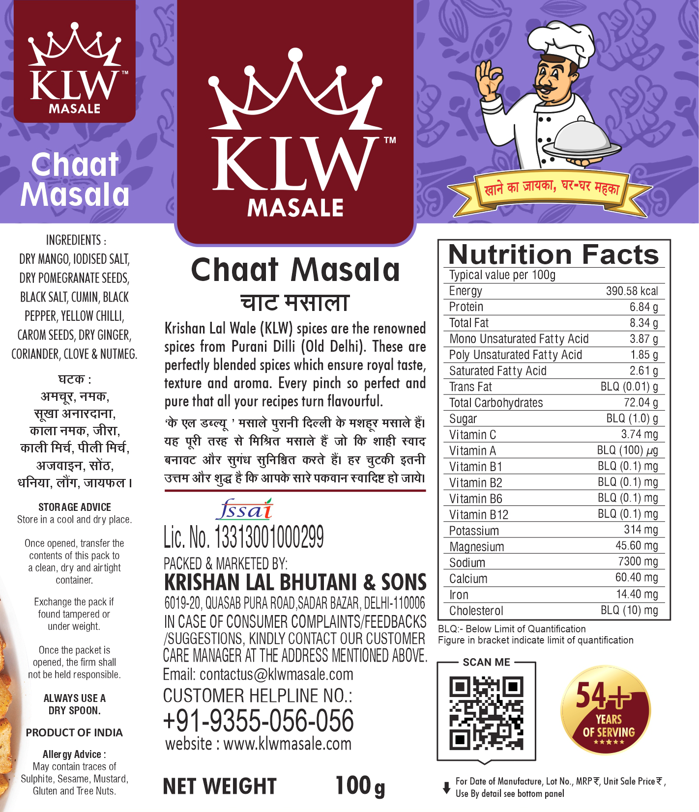 KLW Chaat Masala is a versatile seasoning that adds a delicious burst of flavor to a variety of dishes. Made with traditional Indian spices, this chaat masala can be used to enhance the taste of fruit bowls, salads, party snacks, and all kinds of Indian chaats. Elevate your meals with just a sprinkle of this tasty seasoning.