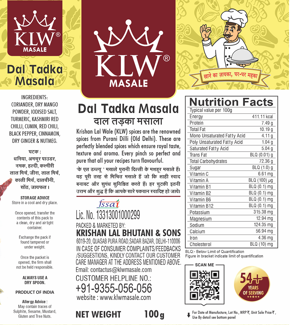 Elevate your cooking with KLW Dal Tadka Masala. This authentic blend of spices is specially crafted for yellow dal, making it the perfect accompaniment to your meals. Impress your guests with this classic dish and savor its rich and traditional flavor. Take your cooking to the next level with KLW Dal Tadka Masala.