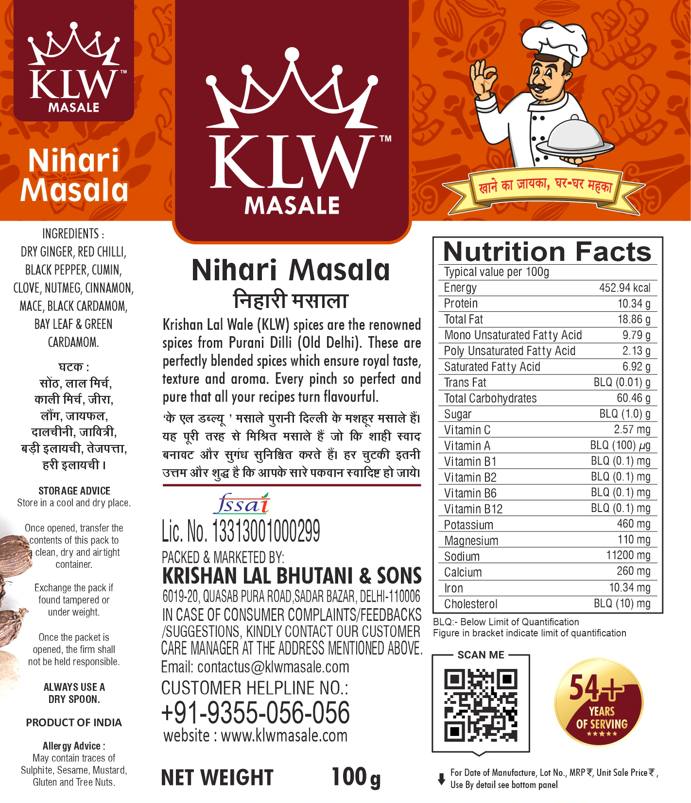 Experience the authentic taste of Old Delhi with KLW Nihari Masala. The slow-cooked dish with a myriad of aromatic spices, our Nihari blend adds a unique and flavorful touch. Unlock the true potential of your cooking with our Nihari Masala.